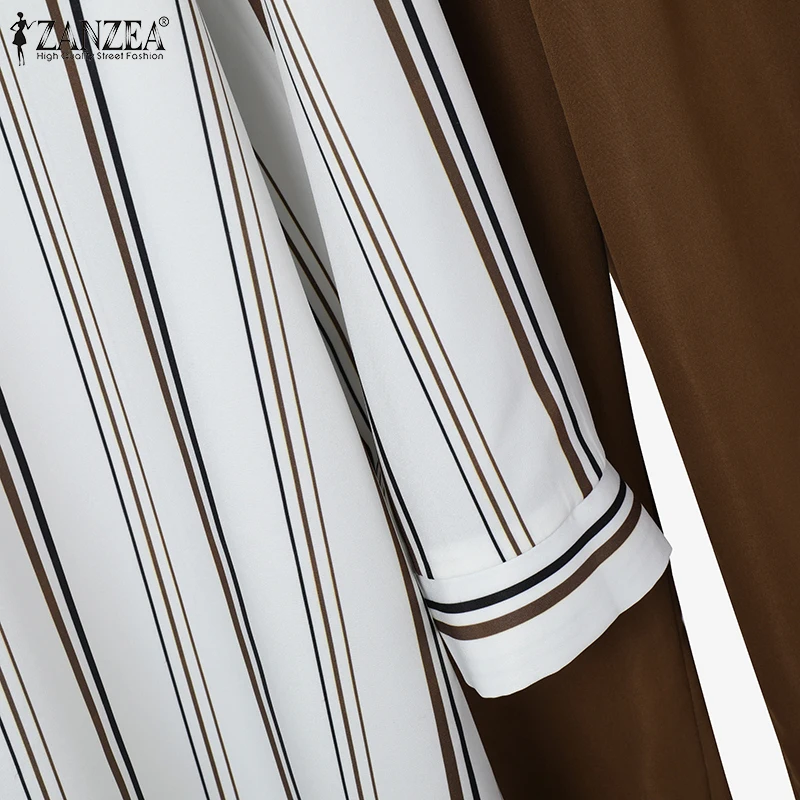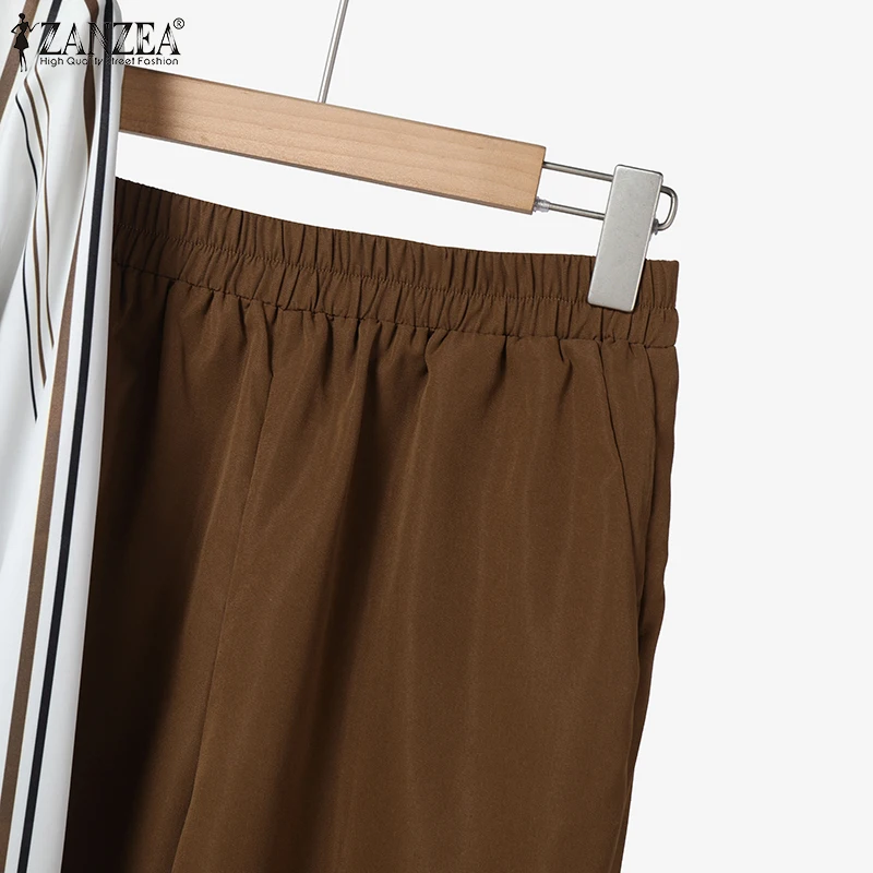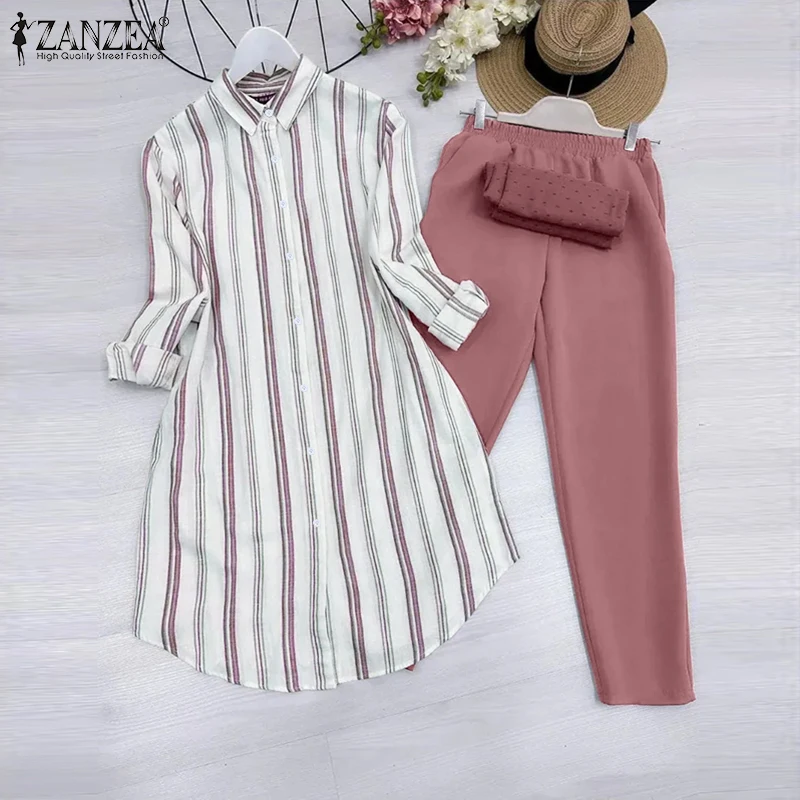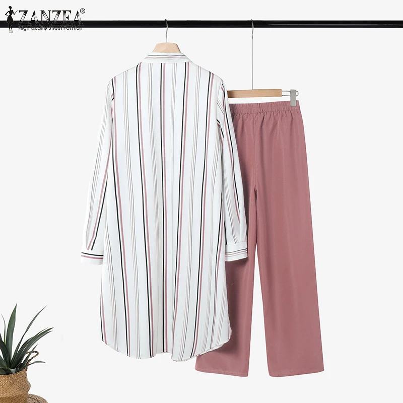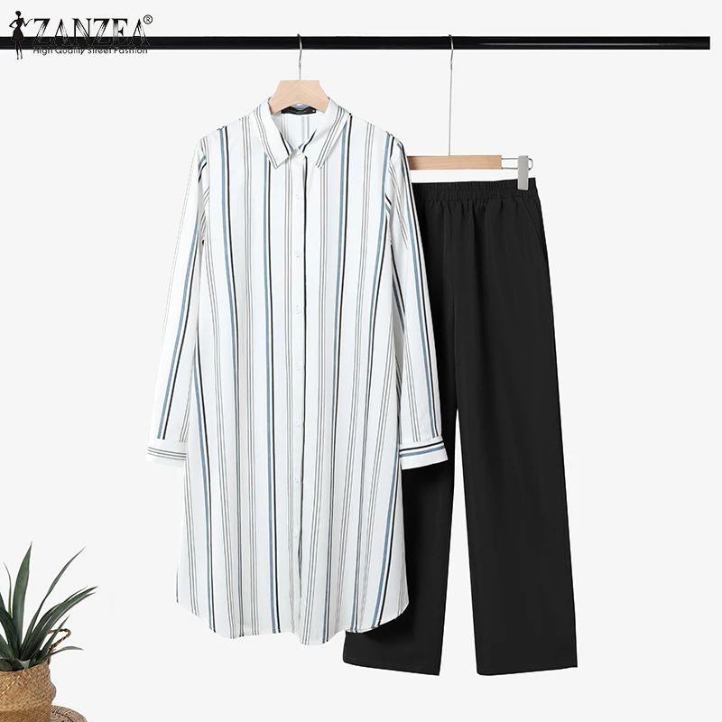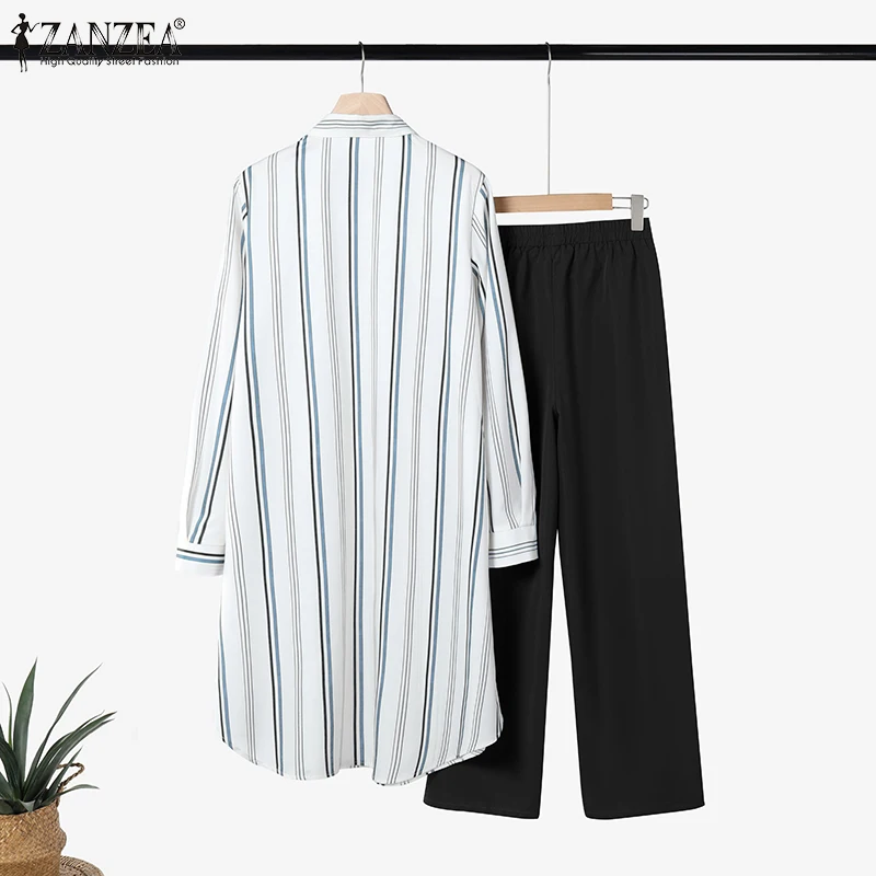 2026 ZANZEA Women Striped Elegant Sets Autumn Two-piece Suits Outfits Casual Lapel Neck Long Shirts Elastic Waist Pants Sets